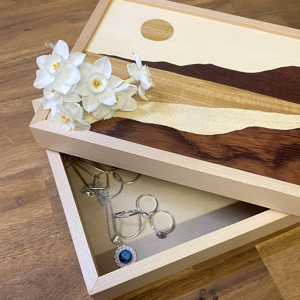 Featured in Image: Desert Sun Timber Box, Hexagon Ring, Dahlia Pendant, Moonstone Ring, Amethyst Ring