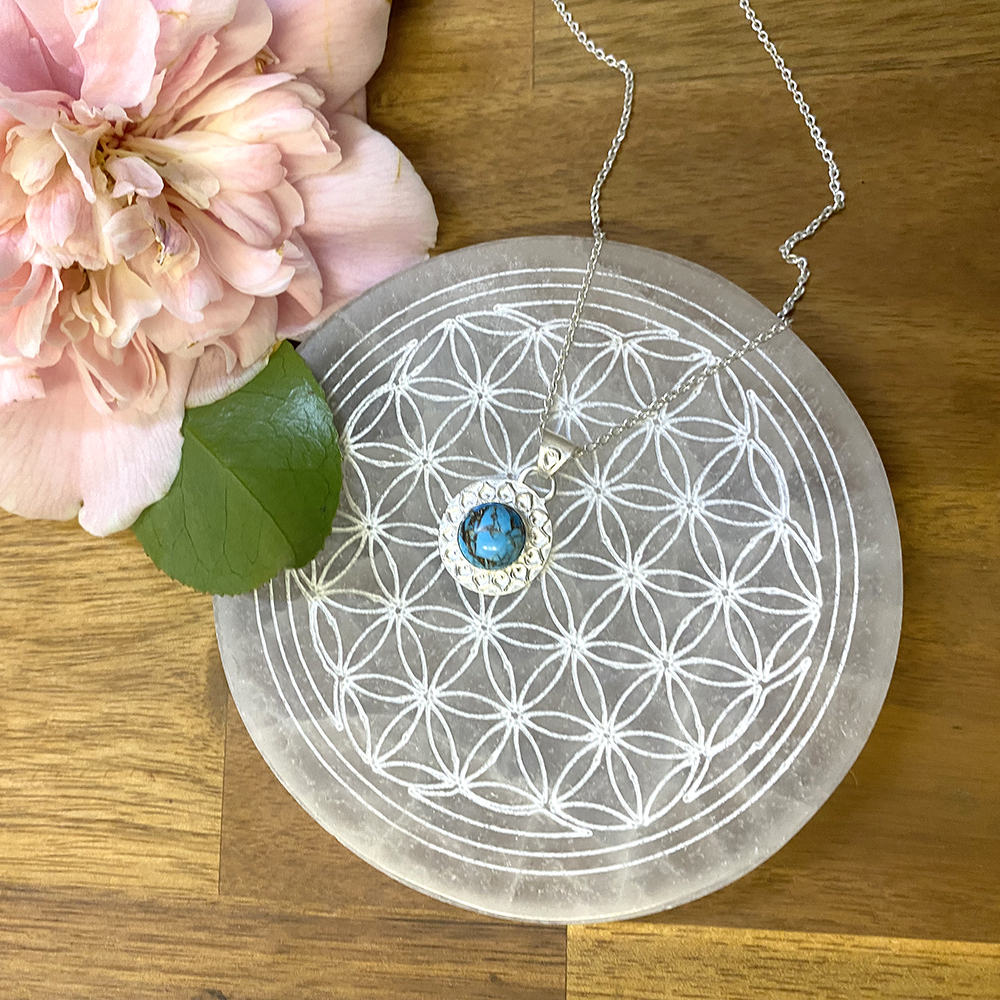 Featured in Image: Dahlia Pendant, Selenite Plate Large