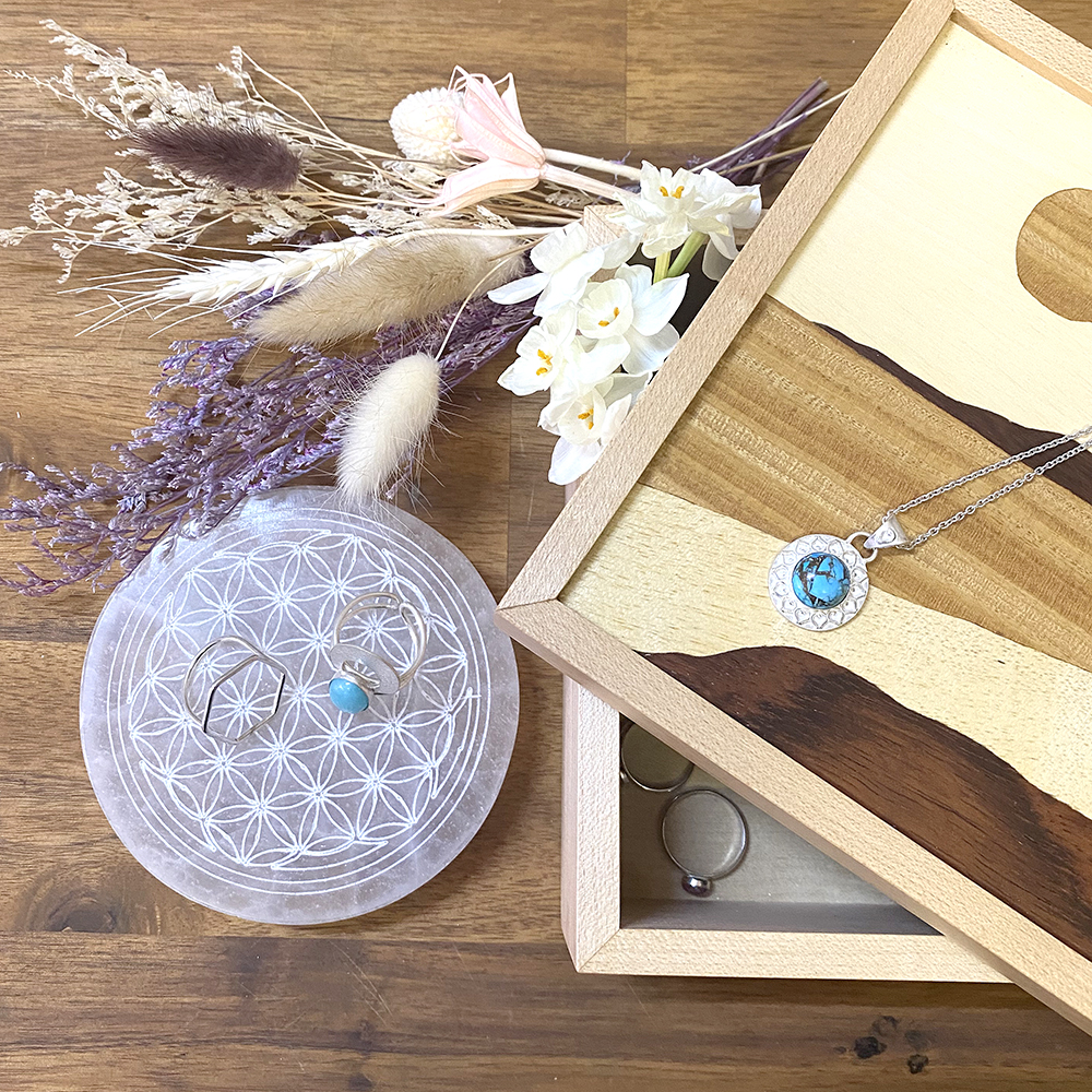 Selenite charging plate: Place your jewellery on selenite overnight to clear and recharge its energy. Selenite is self-cleansing and won’t need recharging itself.